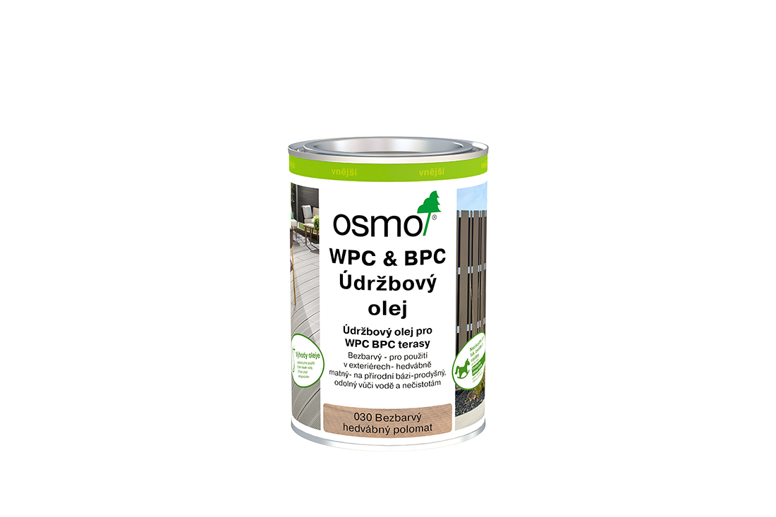 Osmo WPC & BPC údržbový olej je bezbarvý, hedvábně matný údržbový olej, který se vsakuje do dřeva a nevytváří na povrchu žádný film. Díky této impregnaci se ošetřené dřevo stává vodoodpudivým a zvyšuje se jeho odolnost proti tvorbě skvrn a znečištění.