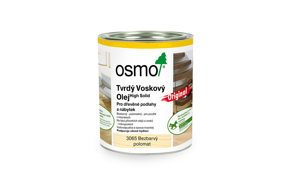 Tvrdý voskový olej Original zesiluje barevnou intenzitu přírodního vzhledu povrchu dřeva, je odolný vůči ošlapání, odpuzuje vodu a nečistoty, je trvale zatížitelný a mimořádně odolný