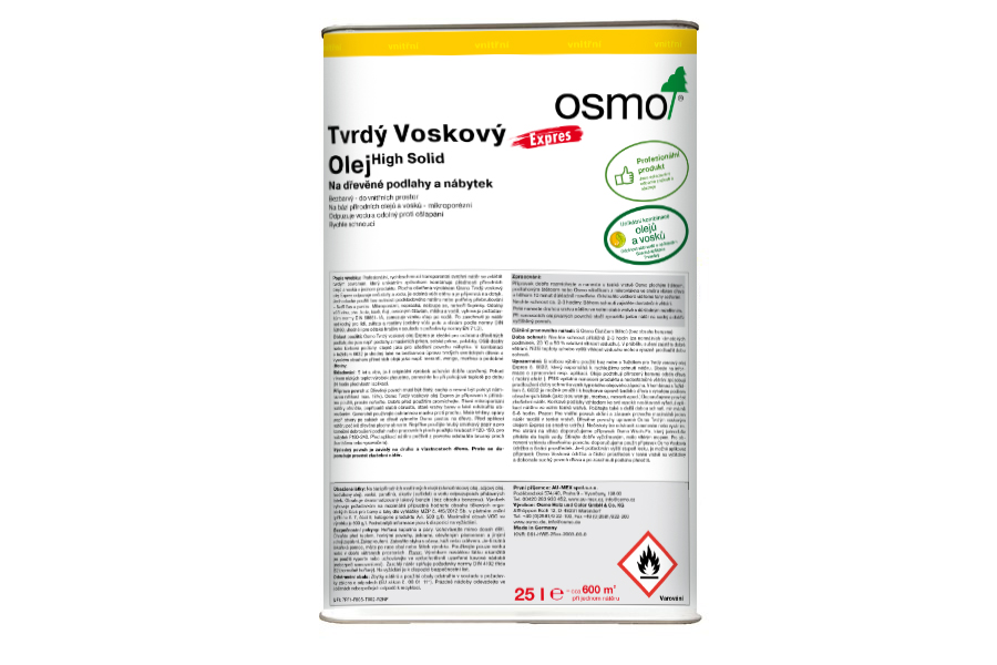 Profesionální, rychleschnoucí transparentní svrchní nátěr se zvláště tvrdým povrchem, který unikátním způsobem kombinuje přednosti přírodních olejů a vosků v jednom produktu. Plocha ošetřená výrobkem Osmo Tvrdý voskový olej Expres odpuzuje nečistoty a vodu, je odolná vůči otěru a je příjemná na dotyk. Jednoduché použití bez nutnosti podkladového nátěru nebo potřeby přebrušování – šetří čas a peníze. Mikroporézní, nepraská, neloupe se, netvoří šupinky. Odolný vůči vínu, pivu, kole, kávě, čaji, ovocným šťávám, mléku a vodě, vyhovuje požadavkům normy DIN 68861-1A, zamezuje vzniku stop po vodě. Po zaschnutí je nátěr neškodný pro lidi, zvířata a rostliny (odolný vůči potu a slinám podle normy DIN 53160, vhodné i pro dětské hračky v souladu s požadavky normy EN 71.3).