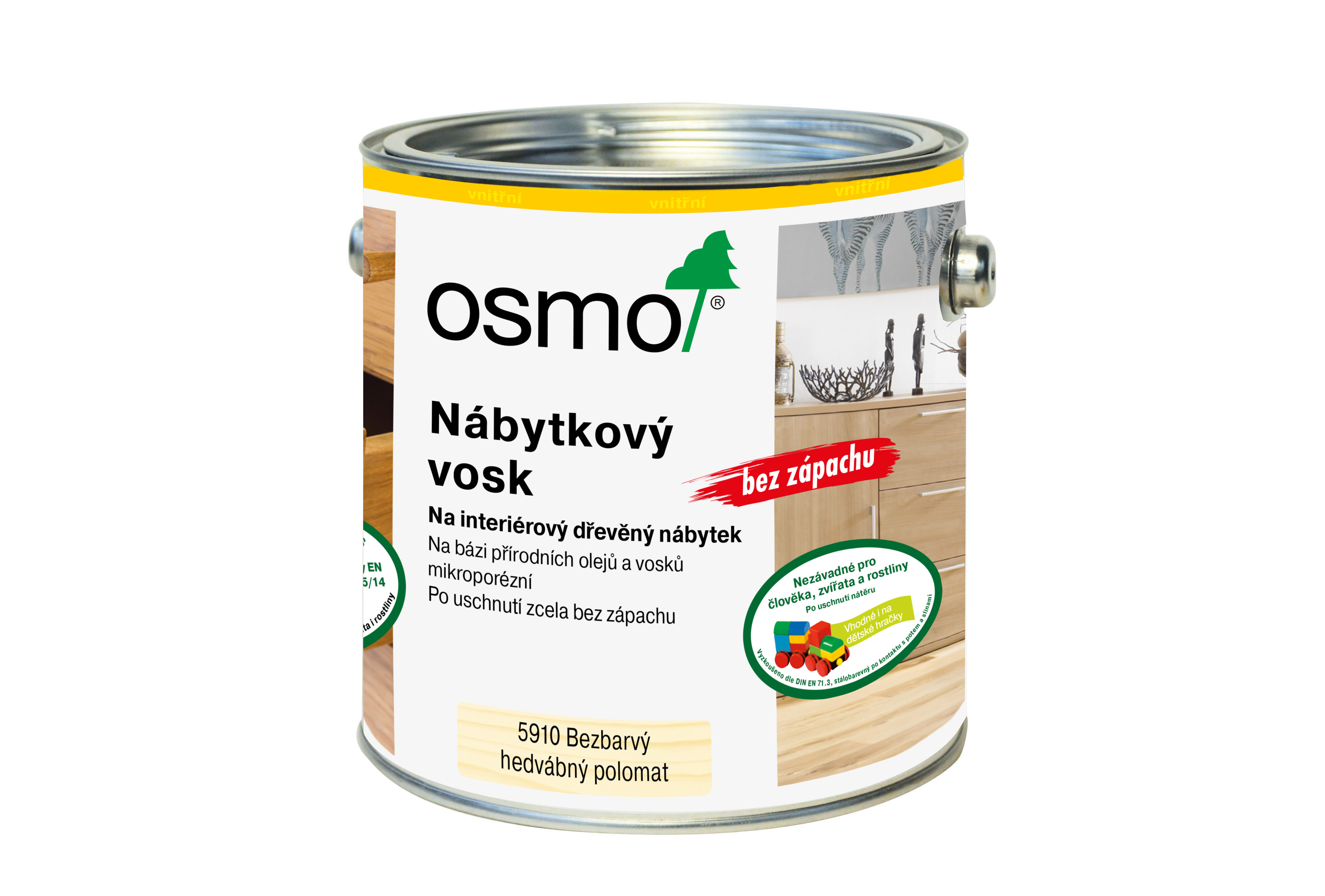 Matný až hedvábně lesklý finální povrch v závislosti na způsobu aplikace. Osmo Nábytkový vosk určený speciálně pro zásuvky vyhlazuje ošetřený povrch. V porovnání s běžnými finálními nátěry vytváří rovnoměrnější zbarvení a harmoničtější vzhled. Jednoduchá aplikace, bez potřeby podkladového nátěru – úspora času i peněz. Vhodný na dřevo, mikroporézní, nepraská, neodprýskává se, neodlupuje se, netvoří šupinky. Po zaschnutí je nátěr neškodný pro lidi, zvířata a rostliny (odolný vůči potu a slinám podle normy DIN 53160, vhodný i pro dětské hračky v souladu s požadavky EN 71.3). Zaschlý povrch splňuje požadavky na migrační limity pro všechny typy potravin v případě krátkodobého kontaktu (do 24 hodin) při pokojové teplotě v souladu s normou EN 1186-5 a -15.