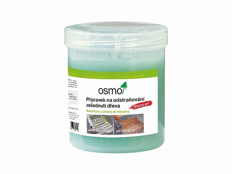 Osmo Odstraňovač šedi ze dřeva – účinný gel je hustý speciální čistící prostředek k oživení a čištění zešedlého dřeva ve vnějších prostorách. Odstraňovač šedi ze dřeva – účinný gel je husté konzistence, a proto nestéká a neodkapává, takže i na svislých plochách ho lze snadno roztírat. Gel působí do hloubky a tím se odstraní šedá patina a následným nánosem oleje se obnoví teplý barevný odstín dřeva.