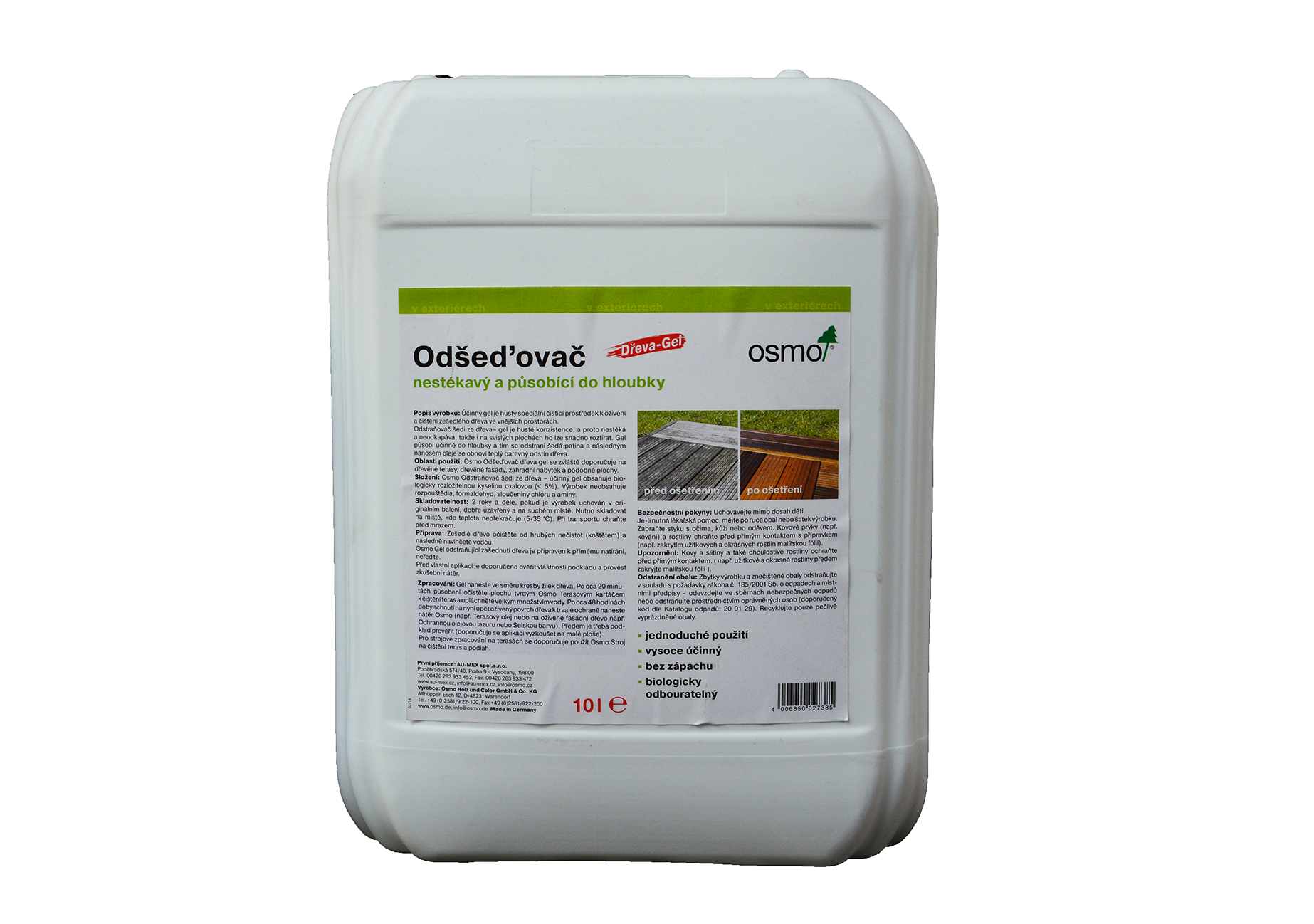 Osmo Odstraňovač šedi ze dřeva – účinný gel je hustý speciální čistící prostředek k oživení a čištění zešedlého dřeva ve vnějších prostorách. Odstraňovač šedi ze dřeva – účinný gel je husté konzistence, a proto nestéká a neodkapává, takže i na svislých plochách ho lze snadno roztírat. Gel působí do hloubky a tím se odstraní šedá patina a následným nánosem oleje se obnoví teplý barevný odstín dřeva.