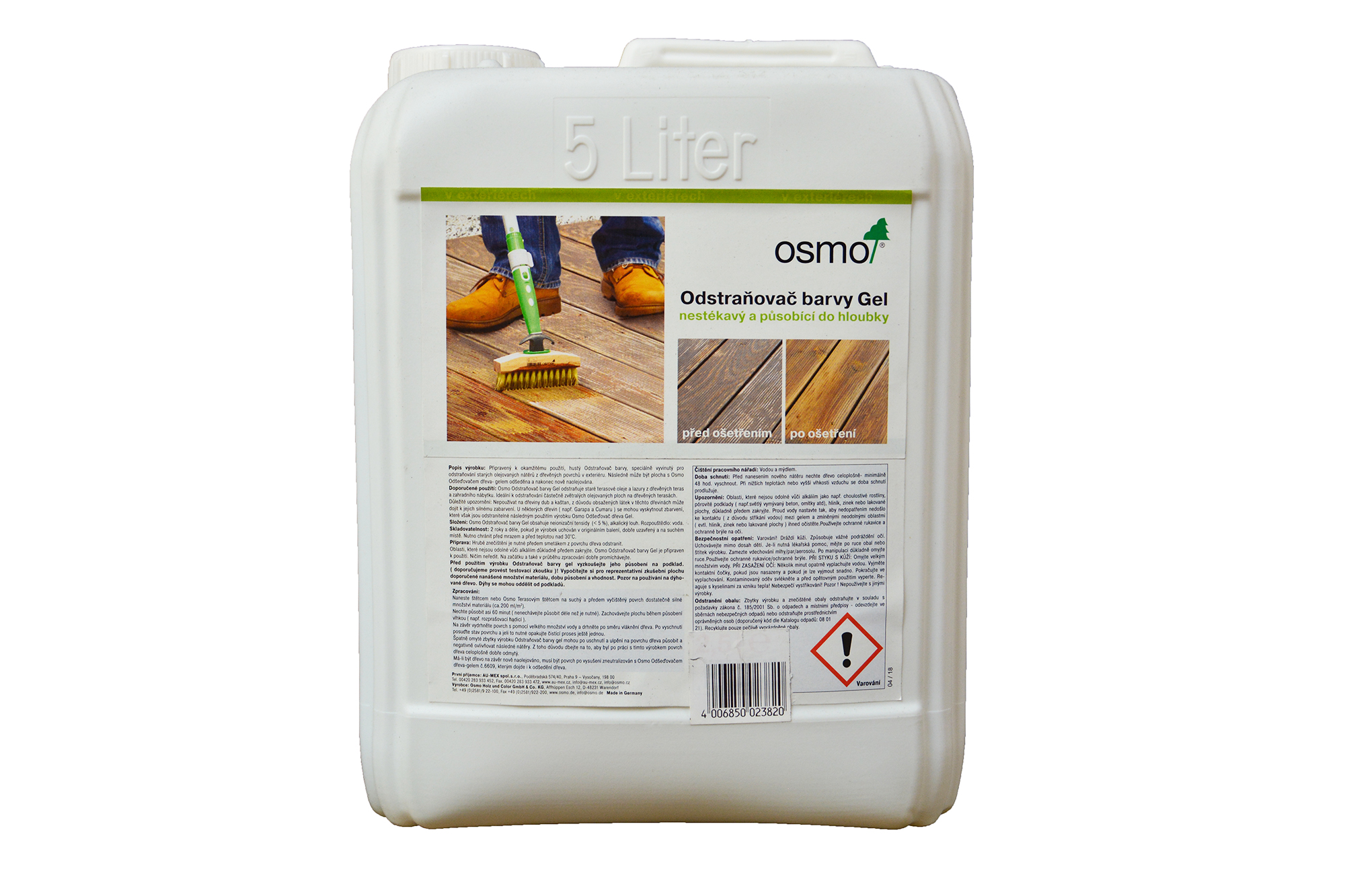 Osmo Odstraňovač barvy- gel odstraňuje staré terasové oleje a lazury z dřevěných teras a dřevěného zahradního nábytku. Ideální k odstraňování olejové vrstvy z částečně zvětralých dřevěných teras, aby bylo dosaženo jednotného vzhledu bez olejového povlaku.