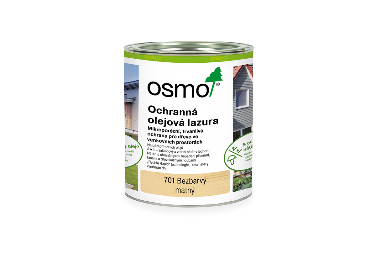 Ochranná olejová lazura č. 701 je matný samostatný nátěr pro svislé chráněné venkovní konstrukce jako jsou střešní podhledy, přístřešky na auta nebo opláštění budov. Osmo Ochranná olejová lazura 701 bezbarvá neposkytuje žádnou ochranu proti UV záření, a proto není doporučována pro aplikace na přímém slunci. Je taktéž vhodná jako bezbarvý, matný vrchní nátěr (pouze pro svislé plochy) na barevné Osmo venkovní vrchní nátěry jako jsou Osmo Selská barva, Osmo Ochranná olejová lazura nebo Osmo Jednorázová lazura HS plus. Docílíte tím dodatečného přírodního matného vzhledu povrchu.