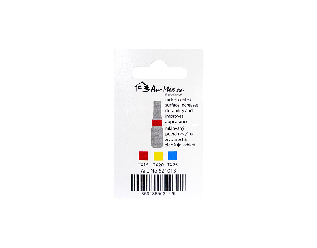 Bity MEX-TOOLS Hobby jsou vyrobeny z vysoce kvalitní oceli S2, známé svou houževnatostí a torzní pevností. Jádro je tepelně upraveno (HRC 58–60) pro vyšší odolnost proti nárazům a deformaci. Niklování zvyšuje korozní odolnost a snižuje tření, díky čemuž je šroubování plynulejší a bity si zachovávají přesnost i při opakovaném použití.