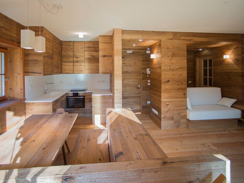 Interiér apartmánu, s podlahou a stěnami z dubového dřeva vytváří společně s povrchovou úpravou OSMO Tvrdý voskový olej polomatný č. 3065 příjemný pocit útulnosti.