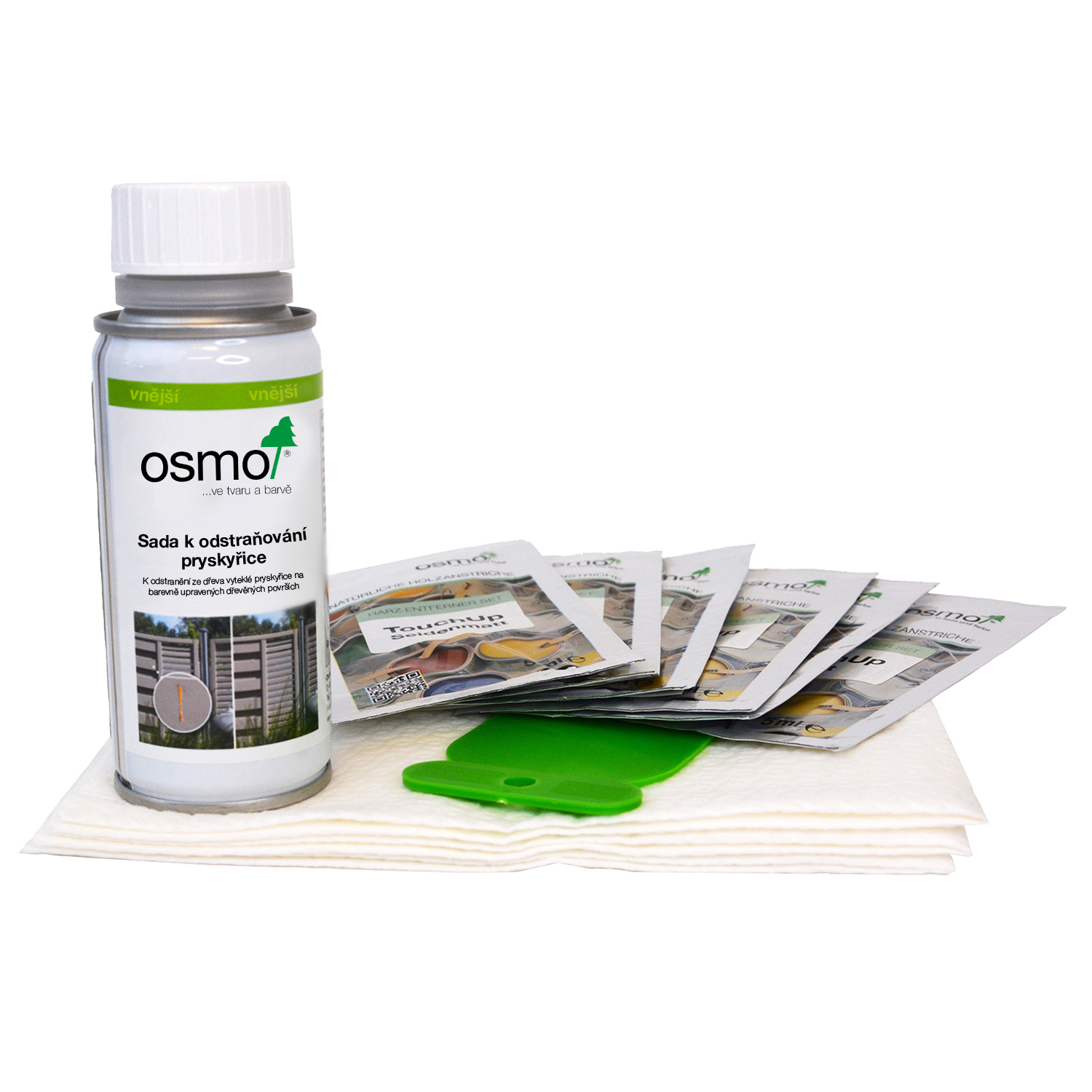 Přiložený čistící hadřík navlhčete přiloženým „ Speciálním odstraňovačem pryskyřice a očistěte zbytek pryskyřice na povrchu dřeva.