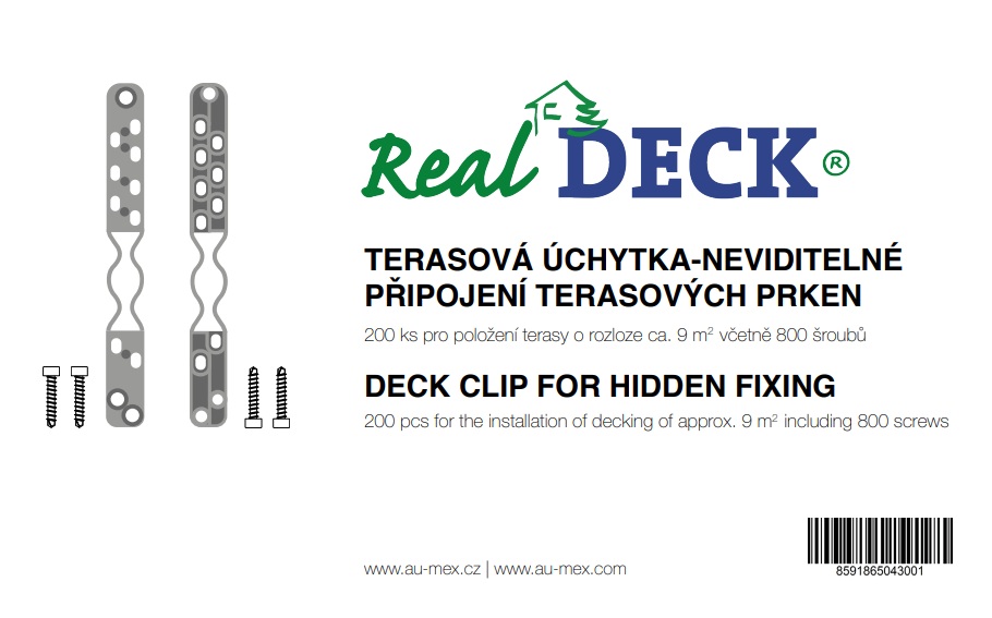Nejpoužívanější terasová úchytka hodící se pro všechny terasy do tloušťky 25mm (pro exotické terasy) nebo 28mm (pro modřínové terasy) které jsou uměle sušené. Tato terasová úchytka je vhodná pro terasy se šířkou prken 120-145 mm. Dodává se v balení po 200 ks a součástí je 800 ks vrutů z ušlechtilé oceli vytvrzené, tzn. ke každé terasové úchytce patří 4 ks vrutů. Balení 200 ks terasových úchytek a 800 kusů vrutů vystačí pro pokládku cca.9 m2 dřevěné terasy při použití terasových dílců o šíři 140 mm.
