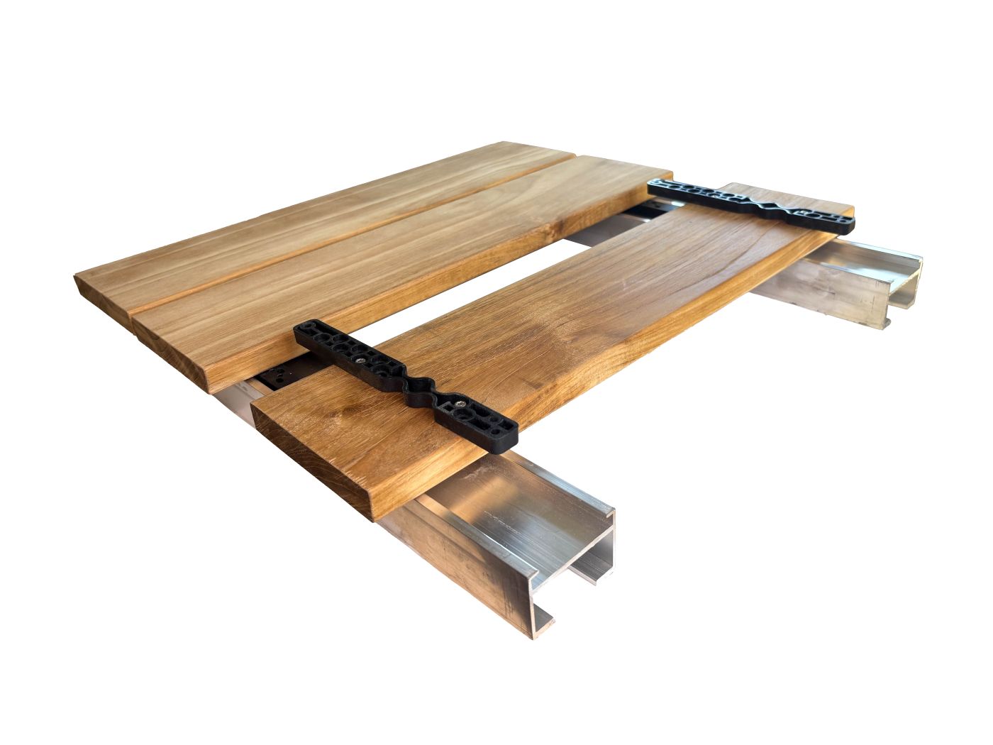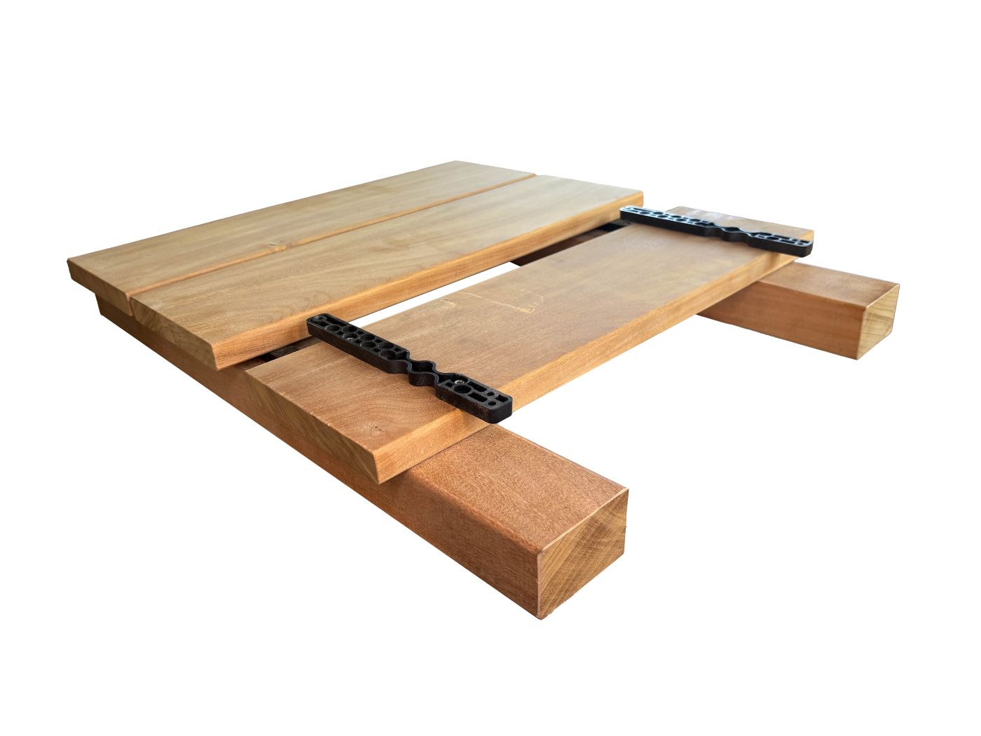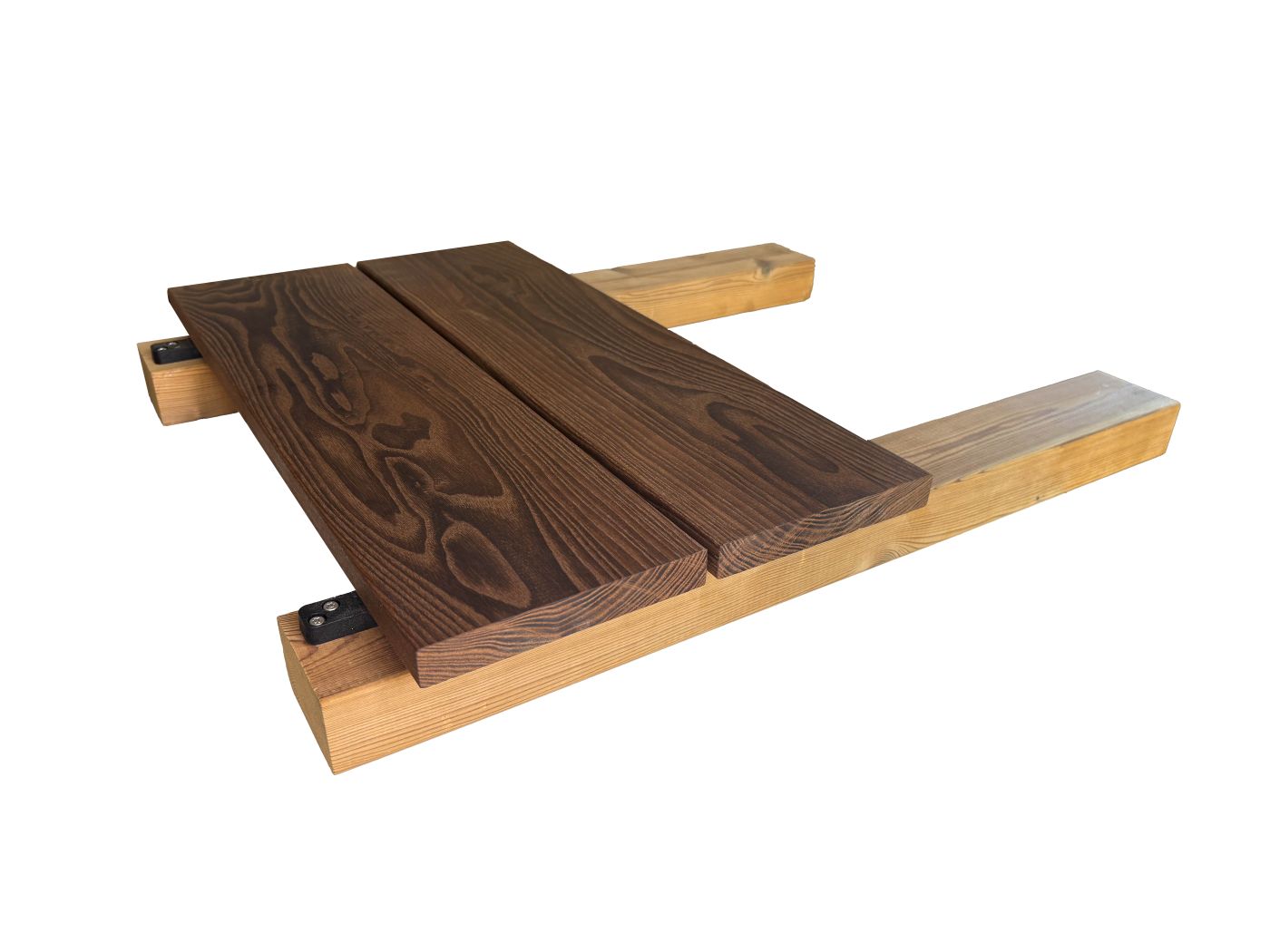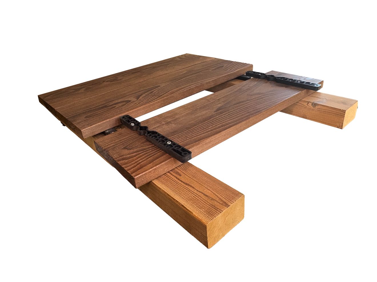 Pro připojení prken se úchytky nejdříve přišroubují na spodní stranu prken a potom ze shora na spodní konstrukci.