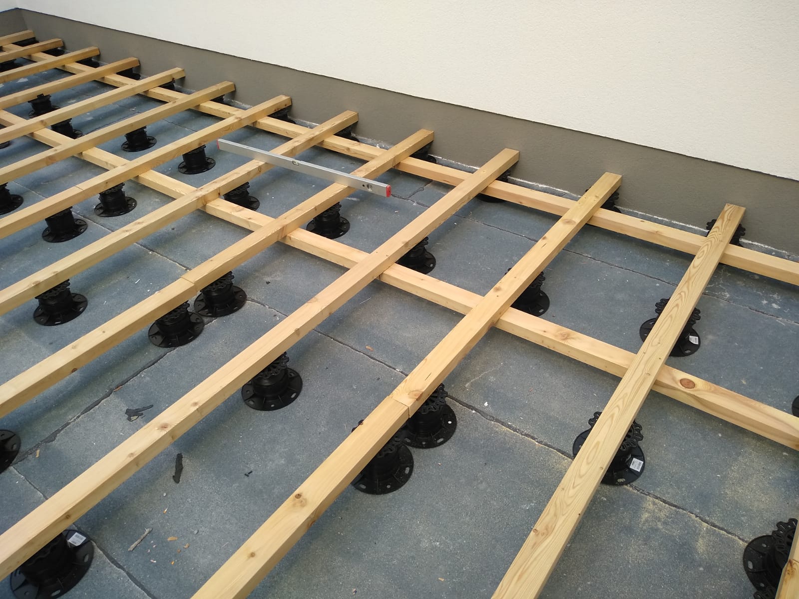Pod konstrukci dřevěné terasy se rektifikační terče instalují po cca. 40-50 cm na osu terče dle zatížení terasy (rozdílnost v hustotě jehličnatého a exotického dřeva). Dřevěné terasy z jehličnatých dřevin o tl. min. 25 mm ( Borovice, Modřín, Sibiřský modřín, Thermo dřevo…: na 1 m2 dřevěné terasy terče instalovat po max. 50 cm na osu terče tzn. je potřeba cca. 5-6 ks na m2 podkladních terčů.